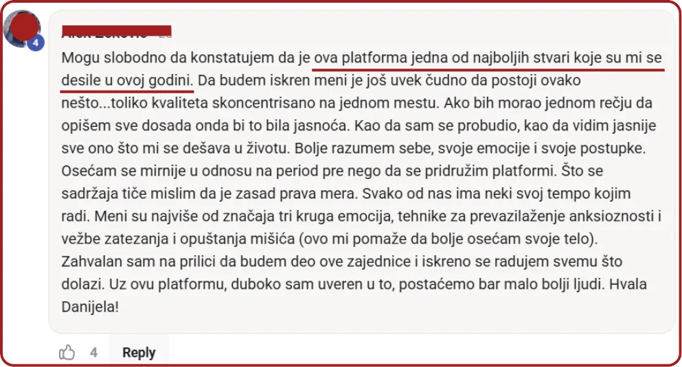 Jer ovo nije samo program ili kurs, ovo je živi prostor podrške i napretka, mjesto gdje nisi prepušten/a sam/a sebi i gdje uvijek možeš da nađeš smislenu smjernicu onda kada ti treba.