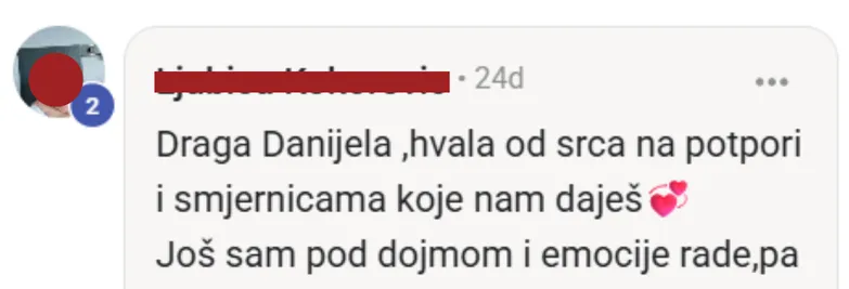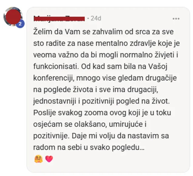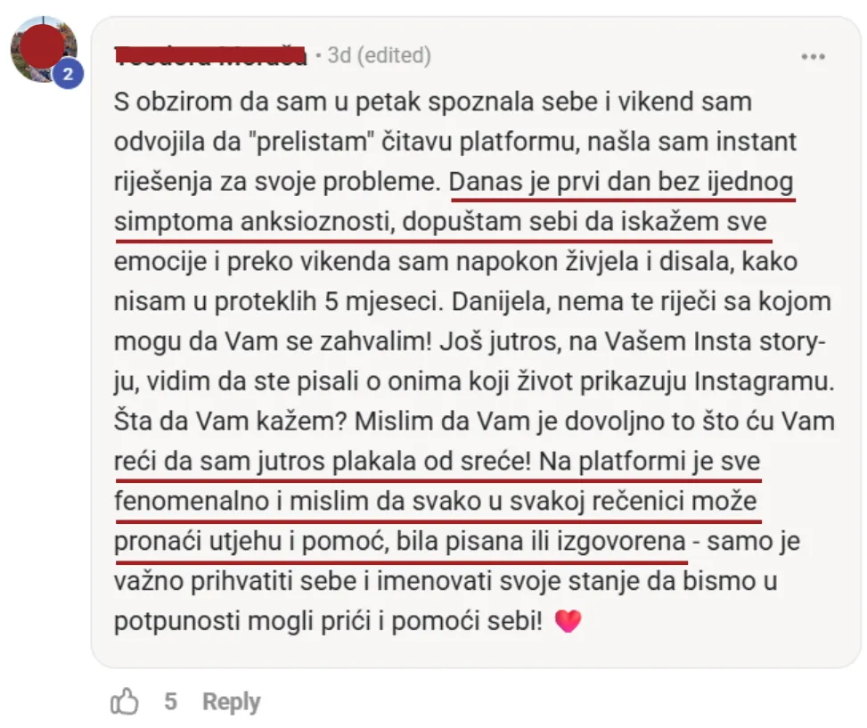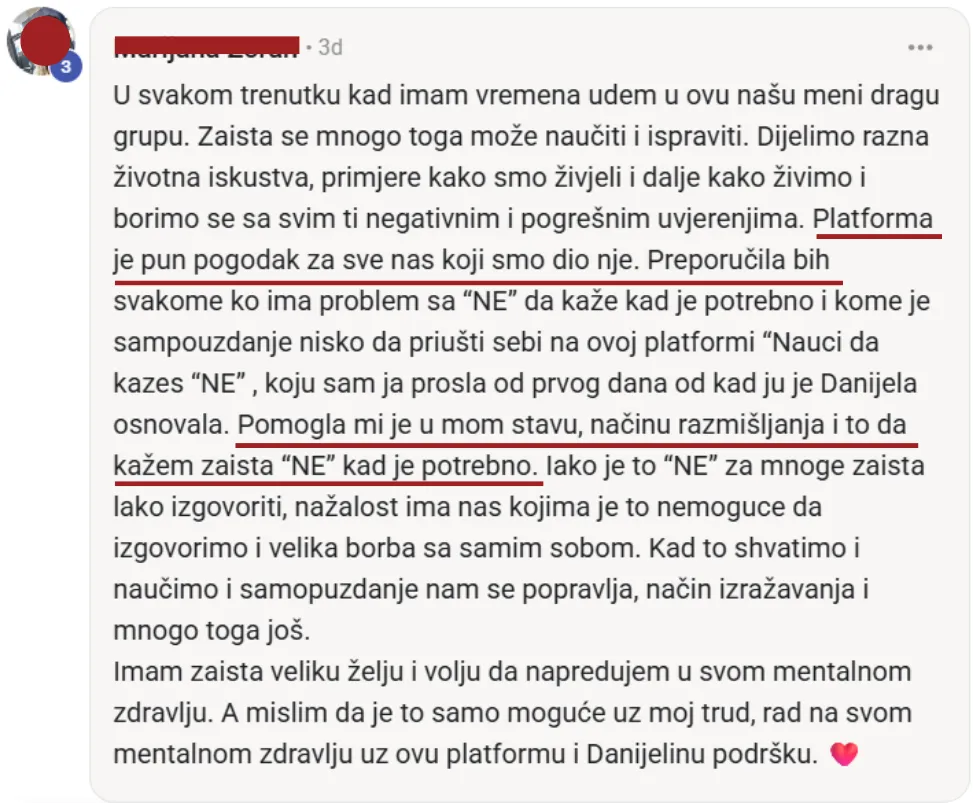 Najljepši dio ove zajednice su ljudi u njoj... njihovi procesi, hrabrost da rade na sebi i promjene koje dođu kada imaju prostor koji ih podržava. Evo nekoliko njihovih iskustava: